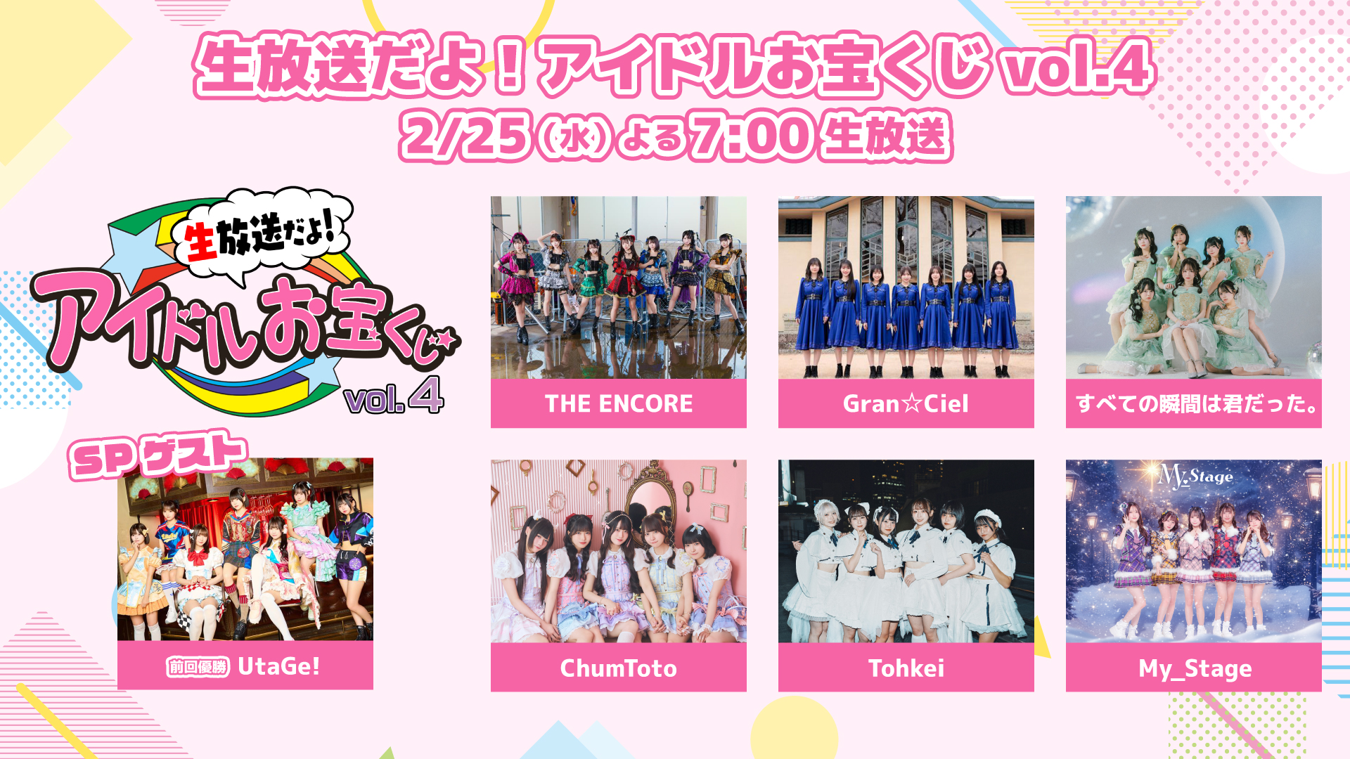 2014〜2017年テレビ朝日、BS朝日、そしてCSテレ朝チャンネルで放送。アイドルがライブパフォーマンスで競う勝ち抜きバトルを繰り広げた伝説のアイドル番組『アイドルお宝くじ』。2021年11月には『帰ってきたアイドルお宝くじ』としてCSテレ朝チャンネルで復活、その後2022年3月に生放送で再復活すると、2024年3月にはおよそ2年ぶりに生放送!そして昨年2025年も『生放送だよ!アイドルお宝くじ vol.3』として生放送で開催。7人組アイドルグループUtaGe!(ウタゲ)がAsIs(アズイズ)との決勝戦を制して優勝。CSテレ朝チャンネル1でのグループ冠特番放送権をゲットし、『UtaGe!の冒険記~はちゃめちゃアドベンチャー~』が放送された。